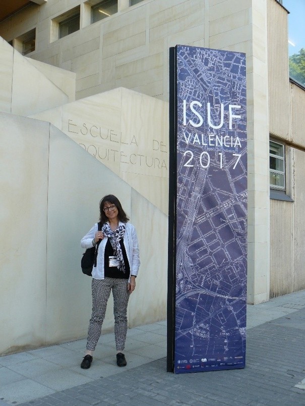 Szkoła Architektury Politechniki w Walencji i logo konferencji ISUF Valencia 2017, z prawej strony autorka relacji